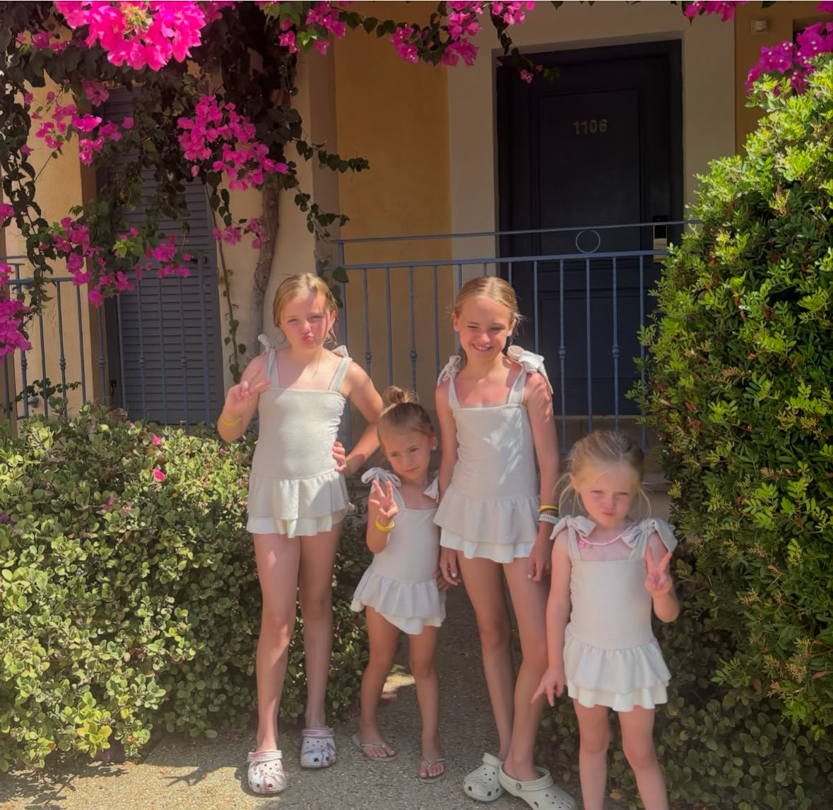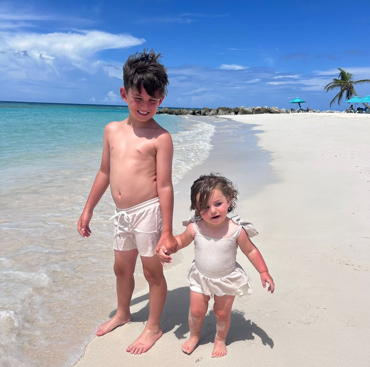 This shimmery cream swimsuit with a ruffle skirt will add some sparkle to your summer wardrobe. Match this with our boys cream swim shorts